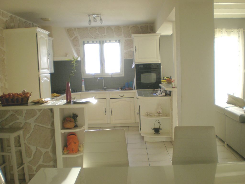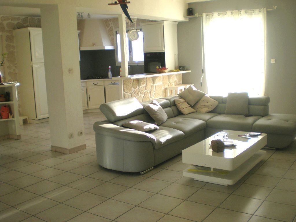 Cuisine ouverte sur l'espace de vie de 59m2, accès à la buanderie, 4 chambres avec placards intégrés et salle de bain au RDC.